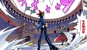 Kaiba announced that the site was too drab and unworthy of their Duel. He got the pillars at the top of the Duel Tower to fold back and activate their Solid Vision projectors, setting up the Sky Duel Coliseum. He declared that they would fight their decisive battle like Roman gladiators and prompted Dark Yugi to draw his sword from his Deck.[11]